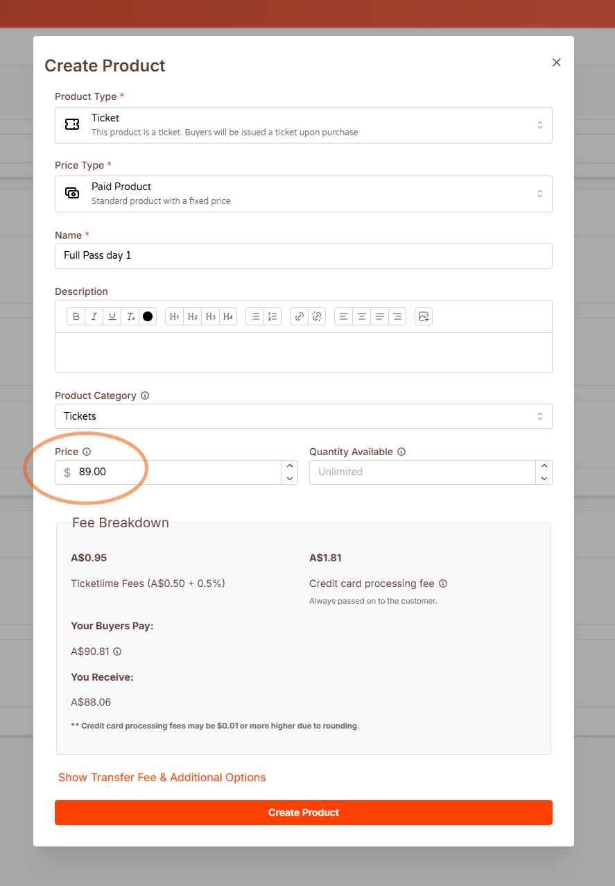 Specify the cost for your ticket. Set it to 0 for free events, or enter your preferred amount. You can also incorporate fees and taxes at a later stage.