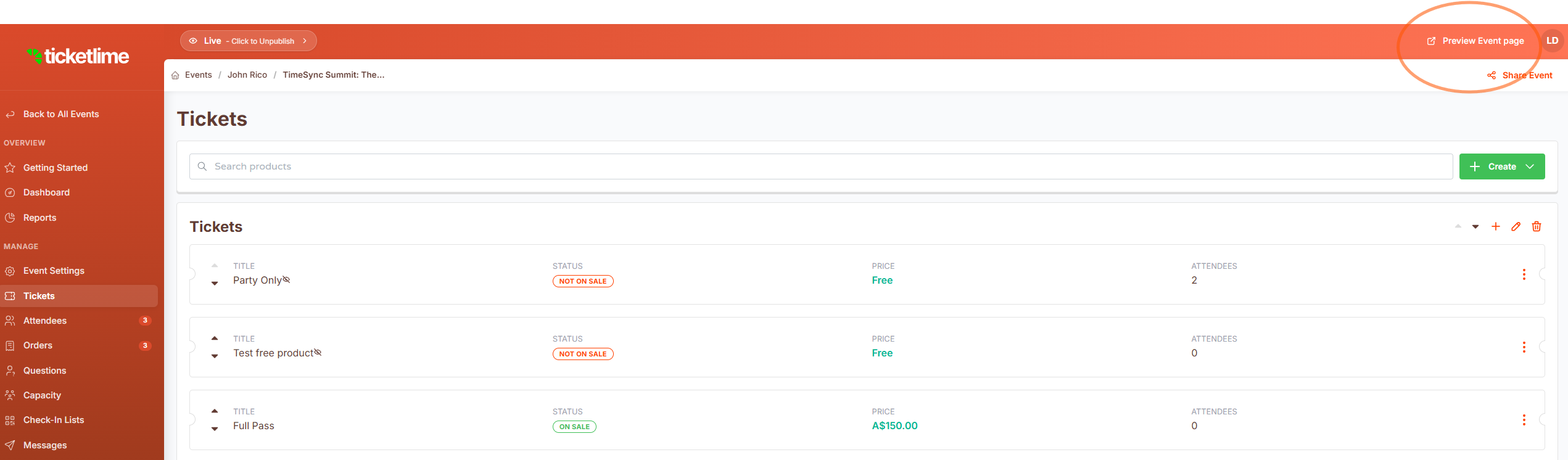 Click "Preview Event page" to view how your event will look to participants. You can make changes to the layout and content from this point.